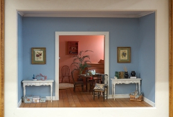 最初は相方Kyokoの爽やかなブルーを基調としたカントリー作品をという提案から始まったのですが、気が付けば大掛かりな作品になっていました。前面はタイトル通りブルーの壁にしながらも、目線を誘導させてるために、奥の部屋はあえて暖色系の色をもってきました。手前を浅く、奥を深くすることで、空間の奥行をより強調することが狙いで、見る側にとっては「覗かないと見えない」じれったさを感じる作品だと思います。他にも空間の広がりを感じさせる演出を随所にこらしてありますので、是非実物を見る機会がありましたら、じっくりと覗き込んで見て下さい。