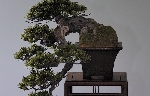 とにかくこのボリュームの五葉松(盆栽)制作には、修行めいたものを感じます。 大量の極細ワイヤーを束ねてねじり樹脂でコーティング、すべての角度から枝ぶりを検証し微調整、それが済んだら表面の仕上げ。次にのべ1万本以上の松葉をひたすら粘土で一本一本制作、そして着色。その中から約5千本強をバランスを見ながら選んで枝の先端にピンポイント接着。その後も枝の向きの調整、場合によっては切断して移し替え・・・丸2ヶ月の間これらの作業を繰り返し、完成に至ります。